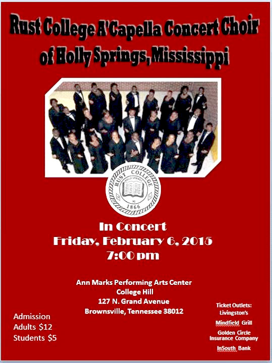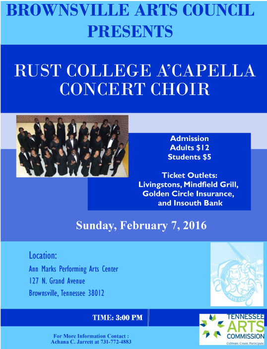 Sunday, February 7, 2016 The Brownsville Arts Council presents the Rust College A'Capella Concert Choir at the Ann Marks Performing Arts Center at 3:00PM. Tickets available at Livingston's, Mindfield Grill, Golden Circle Insurance and InSouth Bank.