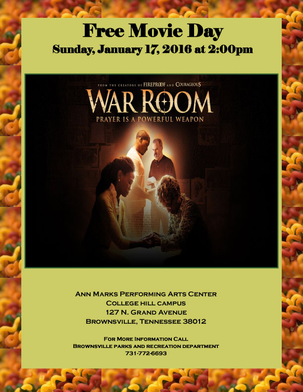Sunday, January 17, 2016 Free Movie Day! Presenting "War Room" at 2:00 PM at the Ann Marks Performing Arts Center. For more information contact the Brownsville Parks & Recreation Department at 731-772-6693.