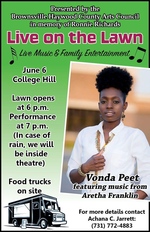 Live on the Lawn presents Vonda Peet, featuring music from Aretha Franklin. Lawn opens at 6:00 p.m. Performance at 7:00 p.m. In case of rain, the show moves inside the theatre. Food trucks will be on site.