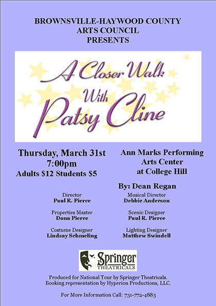 Thursday, March 31, 2016 A Closer Walk with Patsy Cline. 7:00 PM at the Ann Marks Performing Arts Center. Adults $12, Students $5. For more information call 731-772-4883.
