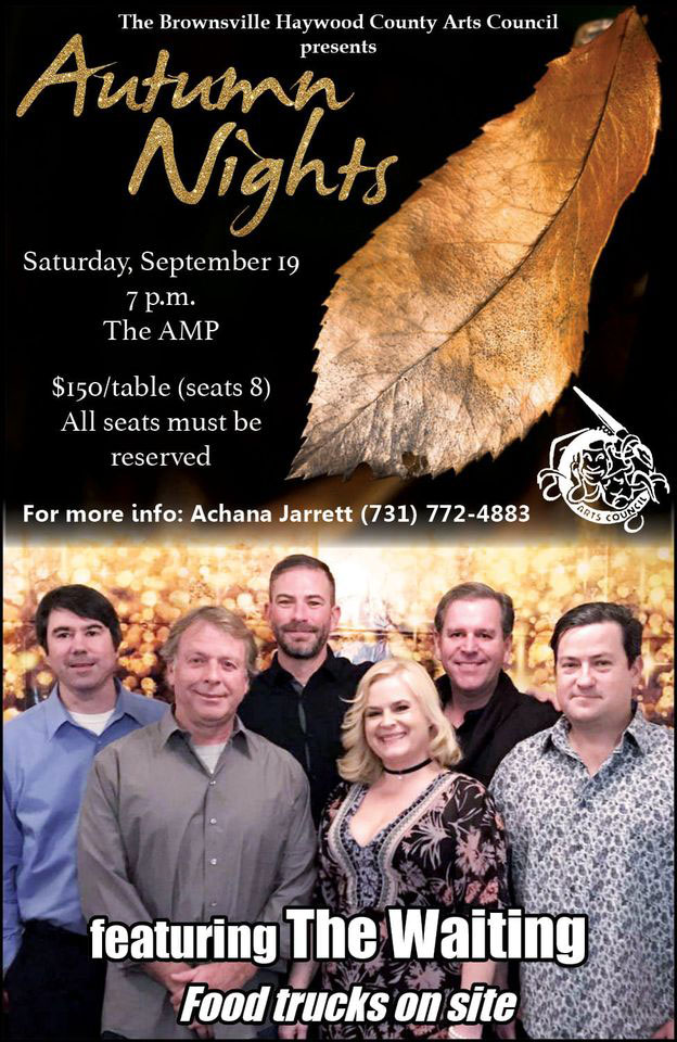 The Brownsville - Haywood County Arts Council presents Autumn Nights featuring The Waiting. Saturday, September 19, 7:00PM at the AMP. Food trucks will be on site.