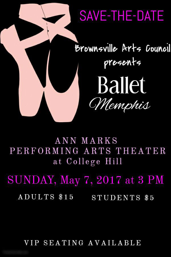SAVE-THE-DATE! Brownsville Arts Council presents Ballet Memphis, Sunday May 7 at 3:00PM in the Ann Marks Performing Arts Theater at College Hill. Adults $15, Students $5. For more information contact Achana Jarret, 772-4883.