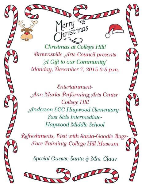 Monday, December 17 Christmas at College Hill: 6:00 - 8:00 PM. Entertainment in the Ann Marks Performing Arts Center by Anderson ECC, Haywood Elementary, East Side Intermediate, and Haywood Middle Schools, plus refreshments, Visit with Santa, goodie bags, face painting and more. Special guests: Santa & Mrs. Claus.