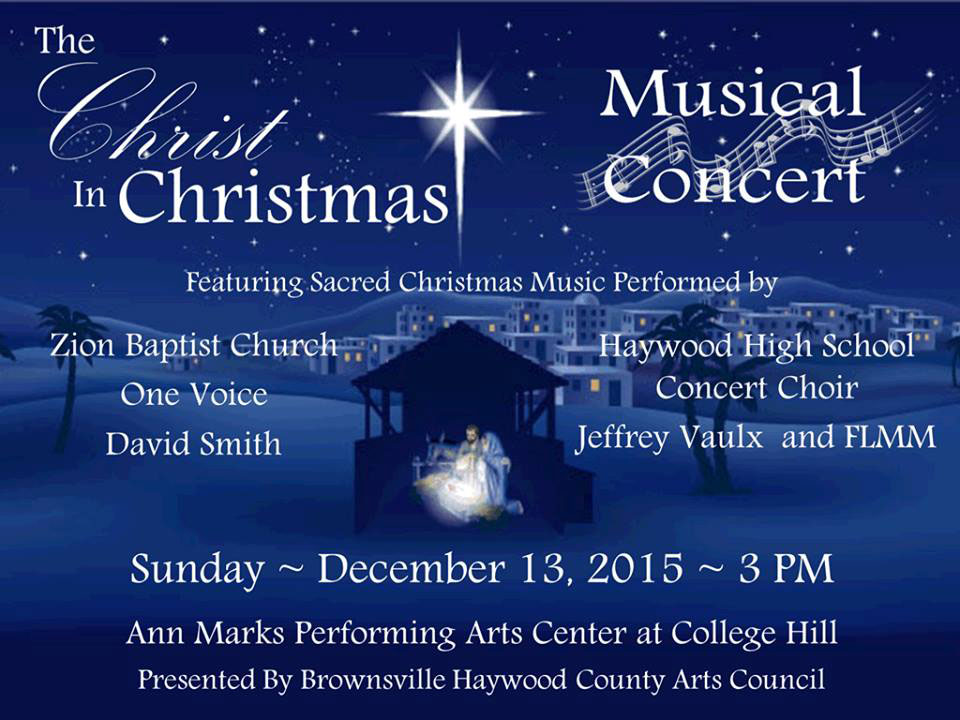 Sunday, December 13 The Christ in Christmas Musical Concert, Sunday @ 3:00 PM. Featuring Sacred Christmas Music performed by Zion Baptist Church, One Voice, David Smith, the Haywood High School Concert Choir, Jerry Vaulx and FLMM. In the Ann Marks Performing Arts Center.