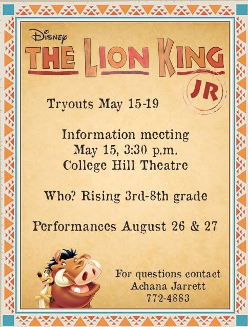 The Brownsville - Haywood County Arts Council is casting for "The Lion King, Jr." Informational meeting on May 15, 2017 at 3:30PM im the College Hill Theatre. Tryouts May 15-19. Who? Rising 3rd - 8th grade. Performances scheduled for August 26 & 27. For more information contact Achana Jarret, 772-4883.
