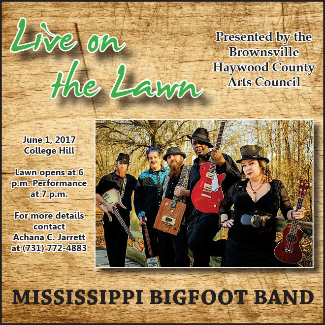 Live on the Lawn with Mississippi Bigfoot Band. Lawn opens at 6PM, performance begins at 7PM For more information contact Achana Jarret, 772-4883.