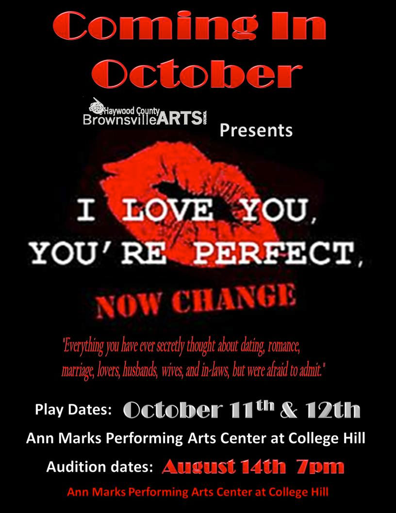 August 14, 2014 - Auditions for "I Love You, You're Perfect, Now Change." 7:00 p.m. In the Ann Marks Performing Arts Center at College Hill.